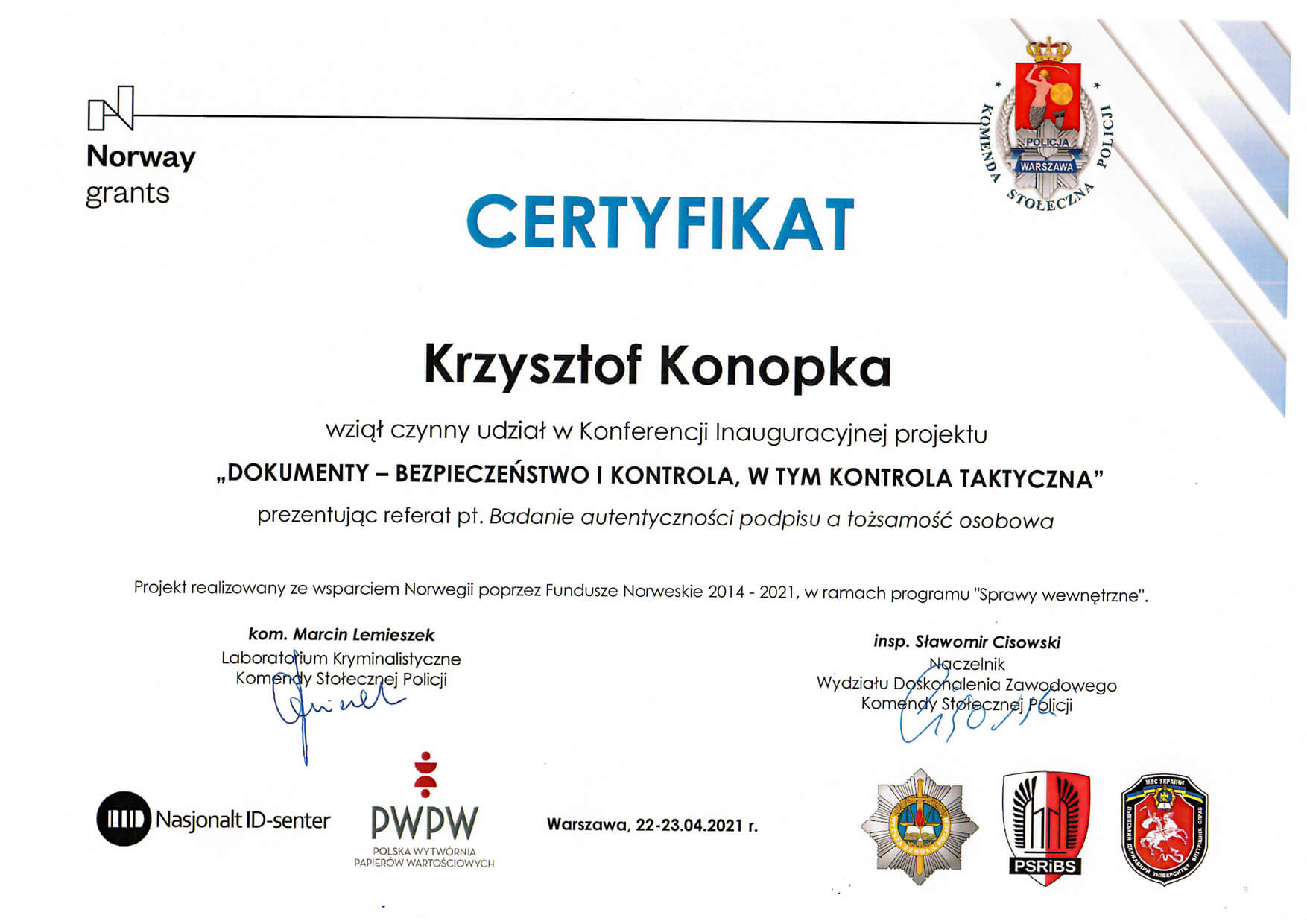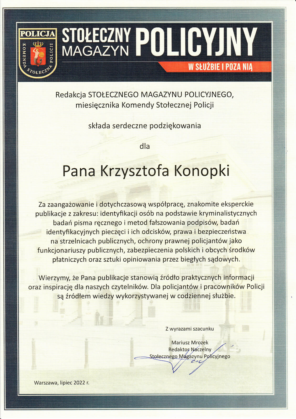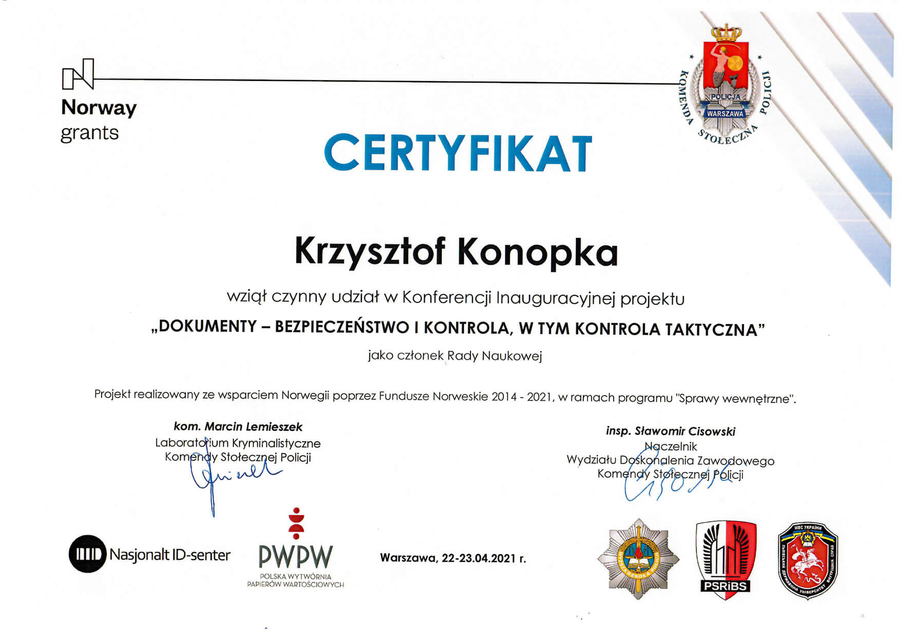 Od 2021 r. – Konsultant Naukowy i Certyfikowany Trener Komendy Stołecznej Policji w dziedzinie kontroli i weryfikacji autentyczności dokumentów publicznych