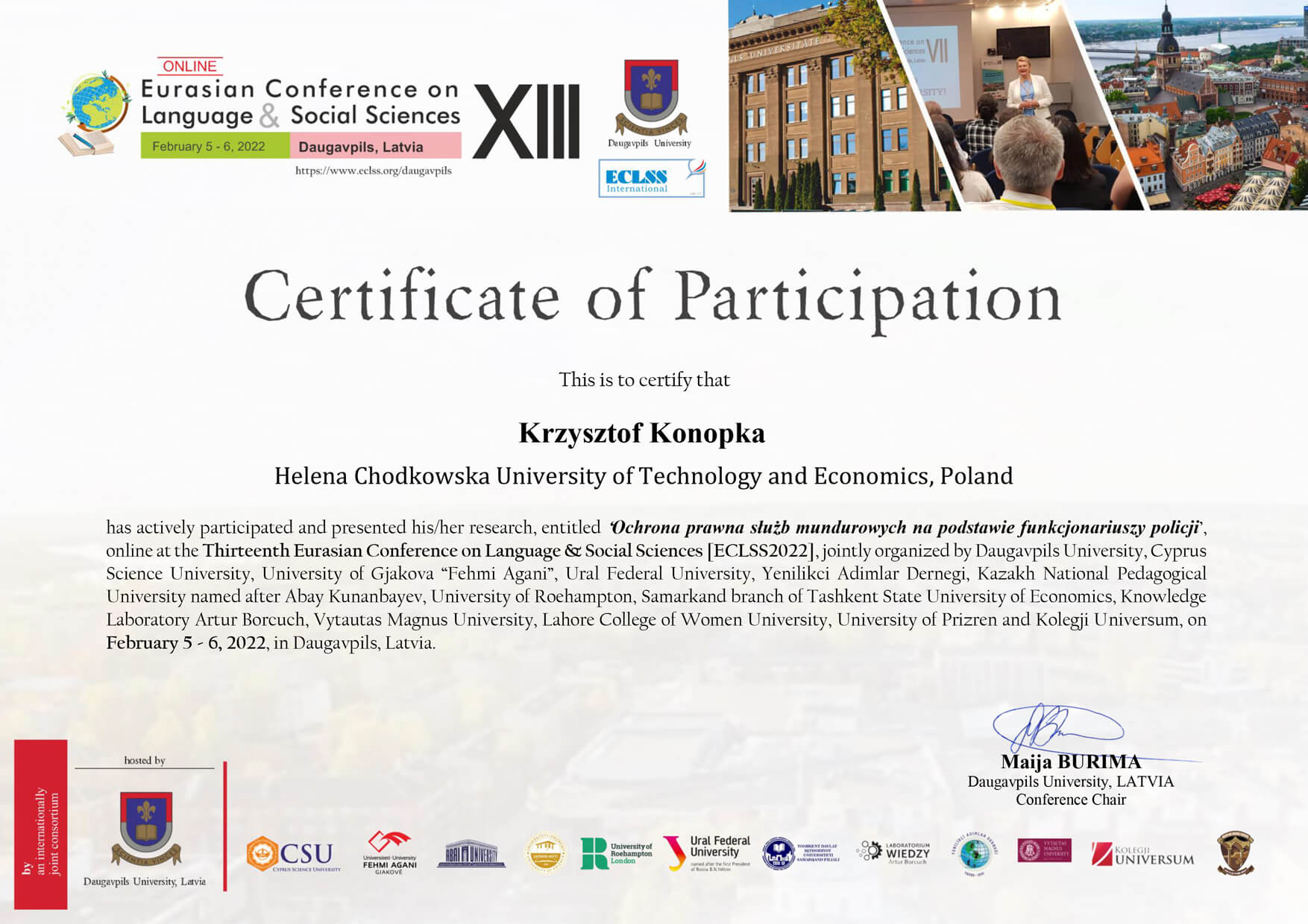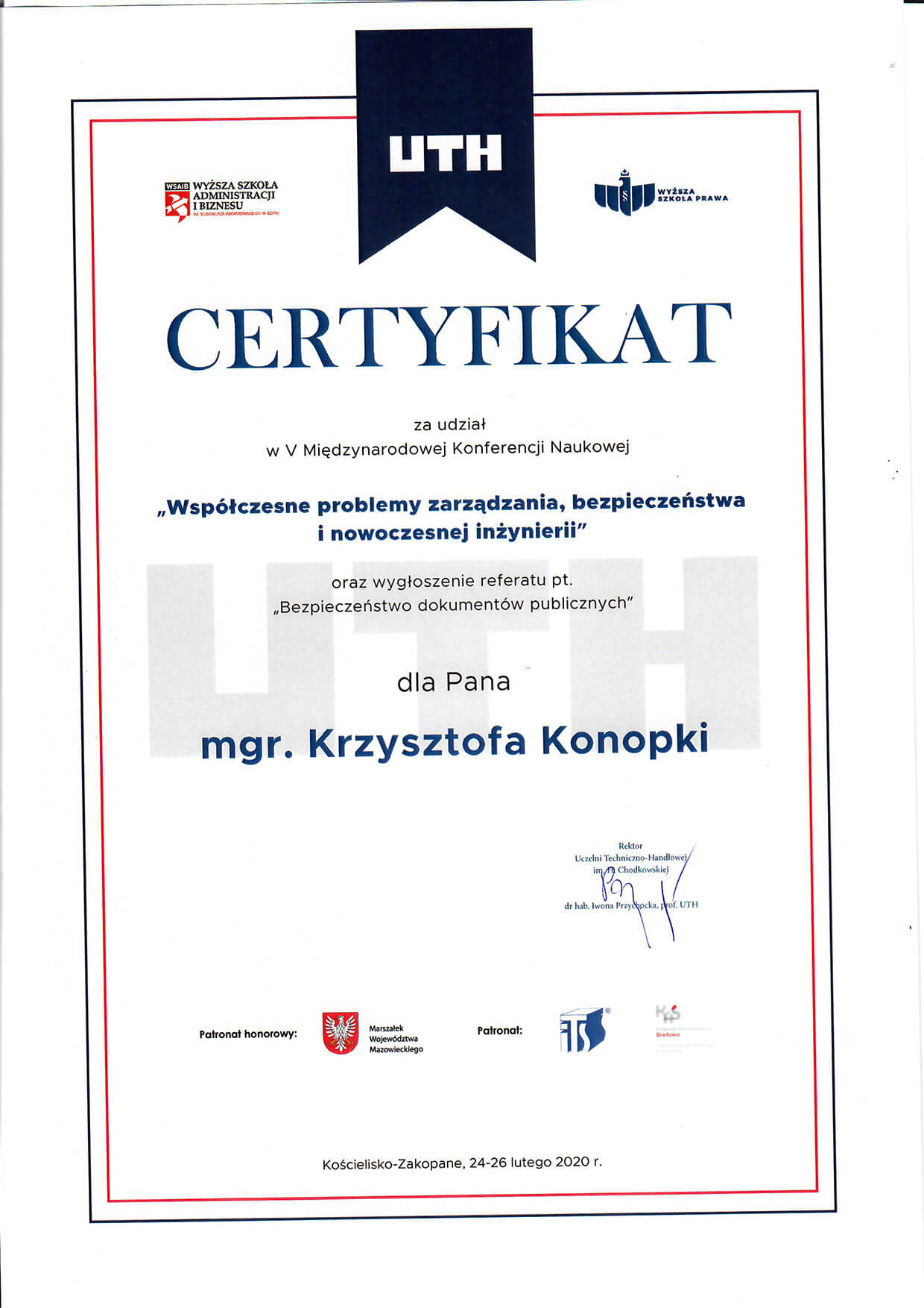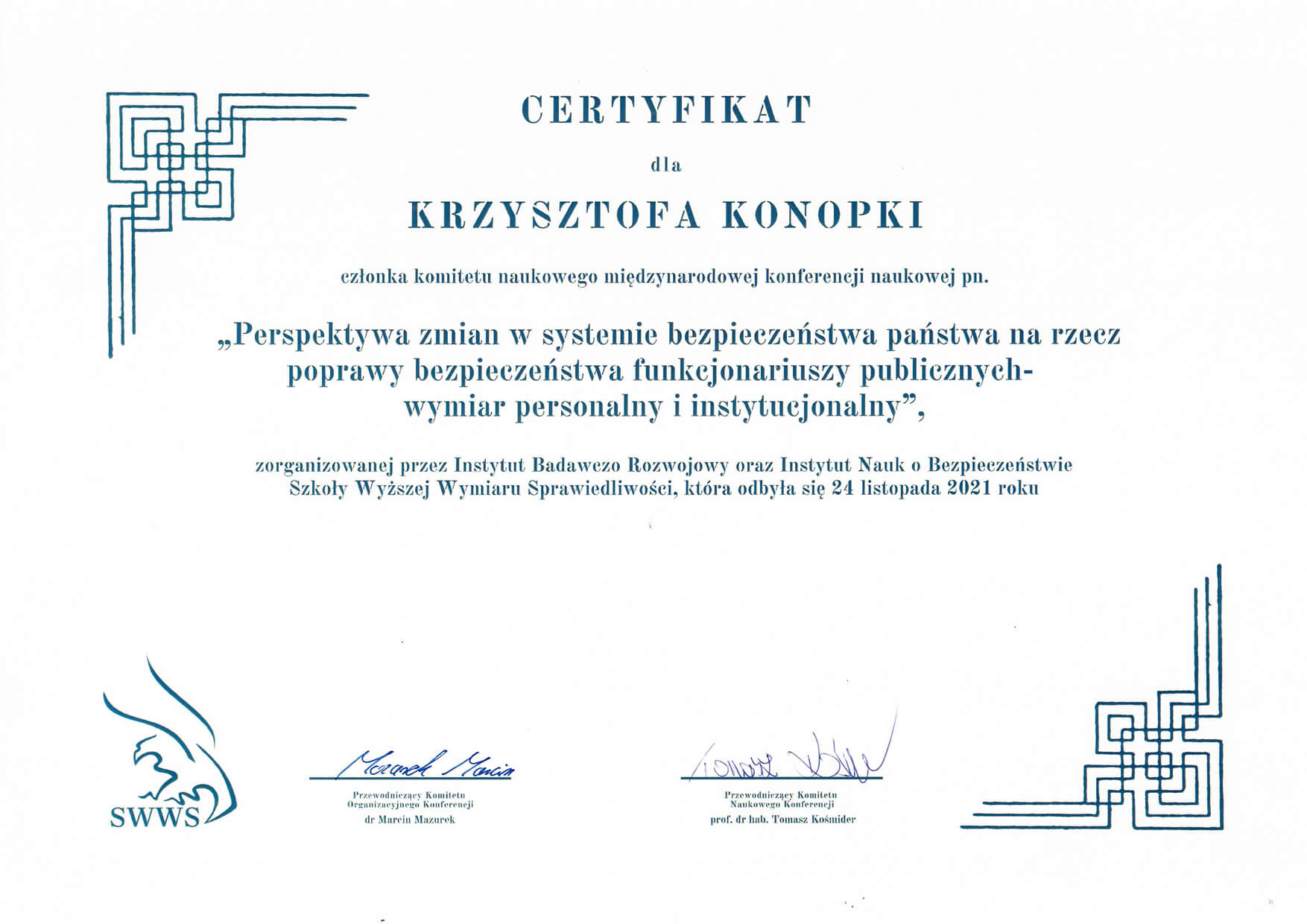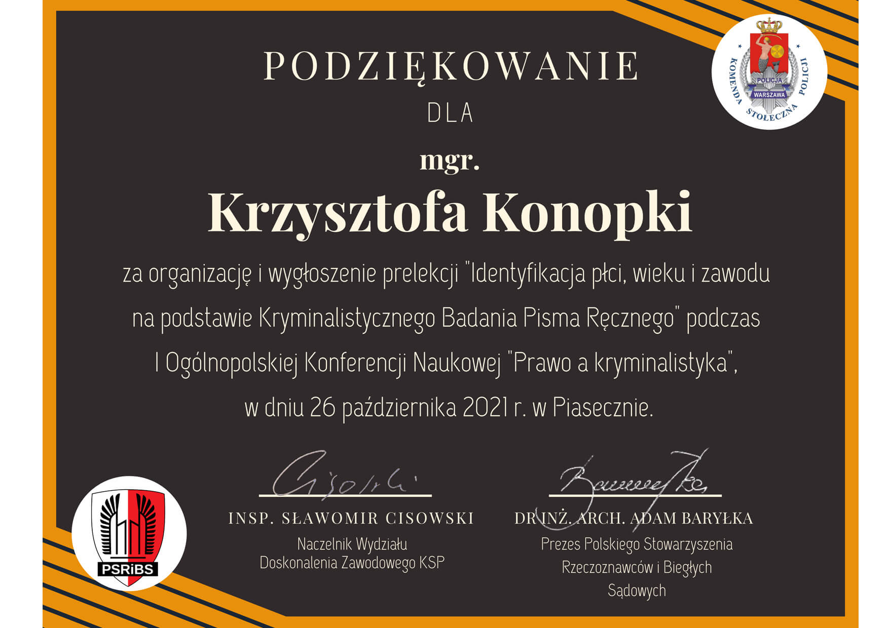 Od 2021 r. – Konsultant Naukowy i Certyfikowany Trener Komendy Stołecznej Policji w dziedzinie kontroli i weryfikacji autentyczności dokumentów publicznych